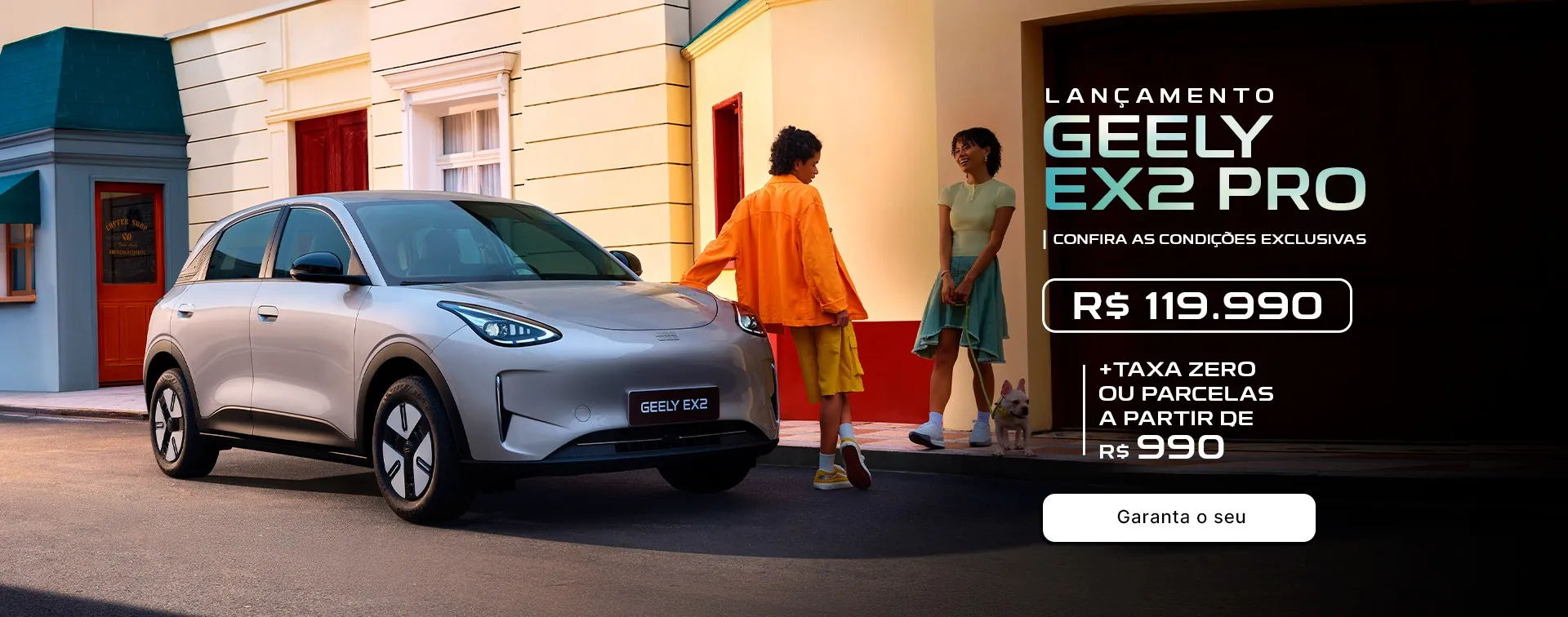 *Condição válida para o veículo Geely EX2, para pessoa física, para aquisição perante a Rede de Concessionárias Geely, nas versões Geely EX2 PRO e Geely EX2 MAX, 0 km, ano/modelo 25/26, até 30/11/2025 ou enquanto durar o estoque. Veículo Geely EX2 PRO preço sugerido à vista de R$ 119.990,00 e veículo Geely EX2 MAX preço sugerido à vista de R$ 135.100,00. Planos de financiamento disponíveis com 60% de entrada e parcelas fixas conforme prazo e taxa vigentes, sujeitos à aprovação de crédito pela instituição financeira parceira. Serviço de conexão 4G disponível apenas para a versão Geely EX2 MAX. O modelo Geely EX2 MAX o consumidor pode optar pelo benefício de recarga gratuita equivalente a 1.500 kW, correspondentes a aproximadamente 11.000 km de autonomia, disponibilizados exclusivamente por meio do App Charge Pass da Mobilize. O crédito será concedido ao primeiro proprietário e terá validade de até 1 ano a partir da data de emissão da nota fiscal. Sujeito à disponibilidade de estoque. Imagens meramente ilustrativas. A aceitação de seminovo está sujeita à avaliação técnica da concessionária, que poderá considerar fatores como quilometragem, estado do veículo, revisões em dia e aprovação em laudo de vistoria. Não serão aceitos veículos com uso comercial, blindados, movidos a diesel, modificados, com sinistros, débitos, gravames ou em nome de terceiros (exceto familiares diretos com comprovação). Todas as condições de elegibilidade, especificações, preços e prazos de entrega podem sofrer alterações sem aviso prévio. Consulte uma concessionária Geely autorizada para mais informações. *Condição válida, para o veículo Geely EX5, para pessoa física para aquisição perante a Rede de Concessionárias Geely para o veículo Geely EX5 PRO, 0Km, ano/modelo 25/26, até 30/11/2025 ou enquanto durar o estoque. Veículo Geely EX5 PRO preço à vista de R$ 195.800,00, já incluso R$ 10.000,00 de bônus. Adicionalmente, escolha entre um super bônus de R$ 15.000,00 ou taxa zero em 18 parcelas fixas, com 60% de entrada. Para mais informações consulte um concessionário Geely. Sujeito à disponibilidade de estoque. Imagens meramente ilustrativas. A aceitação do seminovo está sujeita à avaliação técnica da concessionária, que pode considerar fatores como quilometragem, estado do veículo, revisões em dia e aprovação em laudo de vistoria. Não serão aceitos veículos com uso comercial, blindados, movidos a diesel, modificados, com sinistros, débitos, gravames ou em nome de terceiros (exceto familiares diretos com comprovação). Todas as condições de elegibilidade podem sofrer alterações sem aviso prévio.. Especificações, preços e prazos de entrega podem sofrer alterações sem aviso prévio. Consulte a concessionária autorizada para mais informações.Valor em recarga de 1450 kWh equivalentes a aproximadamente 10.000 km será disponível exclusivamente pelo App Charge Pass da Mobilize e será creditado para utilização de até 1 ano, da data da emissão da nota fiscal. **A garantia está condicionada ao uso adequado do veículo, sem modificações não autorizadas, e ao cumprimento de todos os requisitos de manutenção. Consulte o manual de garantia para mais detalhes e condições de exclusão.