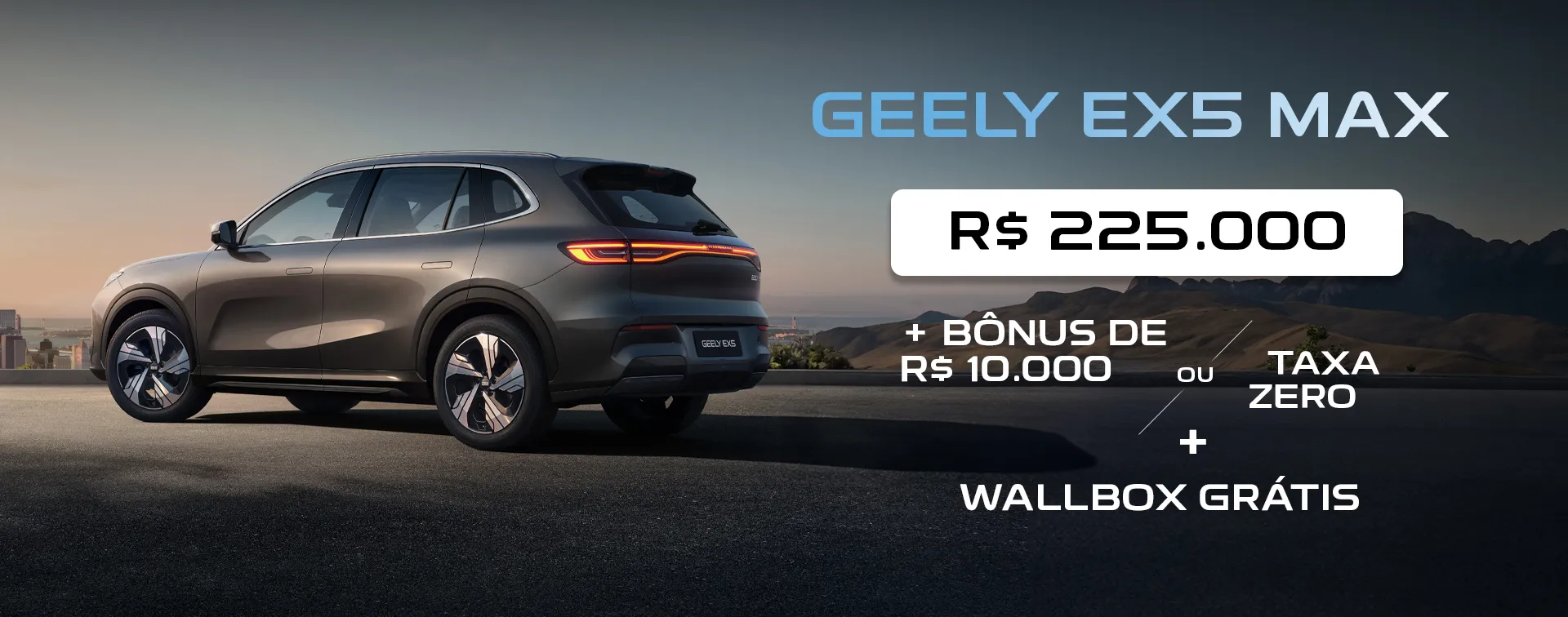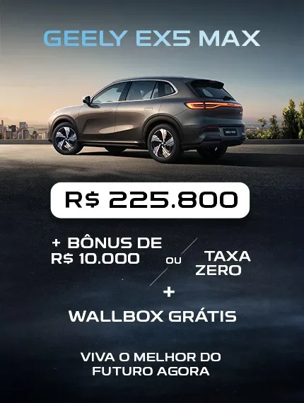 *Condição válida para pessoa física para aquisição perante a Rede de Concessionárias Geely para o veículo EX5 PRO, 0Km, ano/modelo 25/26, até 30/09/2025 ou enquanto durar o estoque. Preço à vista de R$ 195.800,00, já incluso R$ 10.000,00 de bônus. Supervalorização do usado de no máximo R$ 6.000,00 não incluso no preço. Preço a pagar: Nas seguintes condições: 62,70% de entrada (R$ 122.767,00), mais saldo financiado em 36 parcelas fixas de R$ 2.499,00. Taxa de juros de 0,89% (a.m). Tarifa de Cadastro mais Despesas com Registro de Contrato mais Impostos (IOF) inclusos referente ao Estado de SP (variando conforme estado). Para mais informações consulte um concessionário Geely.Sujeito à disponibilidade de estoque. Imagens meramente ilustrativas. A aceitação do seminovo está sujeita à avaliação técnica da concessionária, que pode considerar fatores como quilometragem, estado do veículo, revisões em dia e aprovação em laudo de vistoria. Não serão aceitos veículos com uso comercial, blindados, movidos a diesel, modificados, com sinistros, débitos, gravames ou em nome de terceiros (exceto familiares diretos com comprovação). Todas as condições de elegibilidade podem sofrer alterações sem aviso prévio.. Especificações, preços e prazos de entrega podem sofrer alterações sem aviso prévio. Consulte a concessionária autorizada para mais informações.Valor em recarga de 1450 kWh equivalentes a aproximadamente 10.000 km será disponível exclusivamente pelo App Charge Pass da Mobilize e será creditado para utilização de até 1 ano, da data da emissão da nota fiscal.