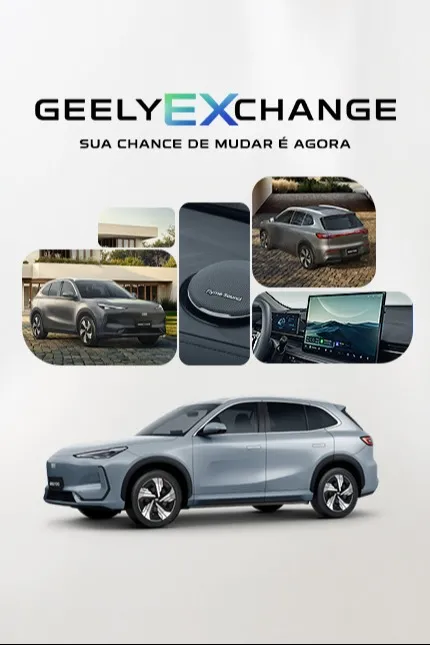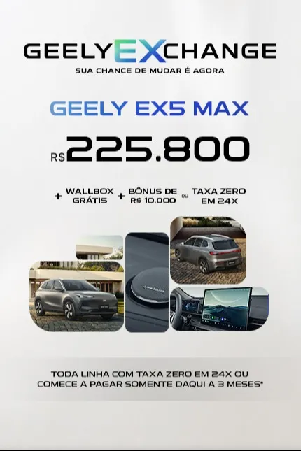*Condição válida para pessoa física para aquisição perante a Rede de Concessionárias Geely para os veículos Geely EX2 (todas as versões) e Geely EX5 (todas as versões), 0 km, ano/modelo 25/26, até 28/02/2026 ou enquanto durar o estoque.
