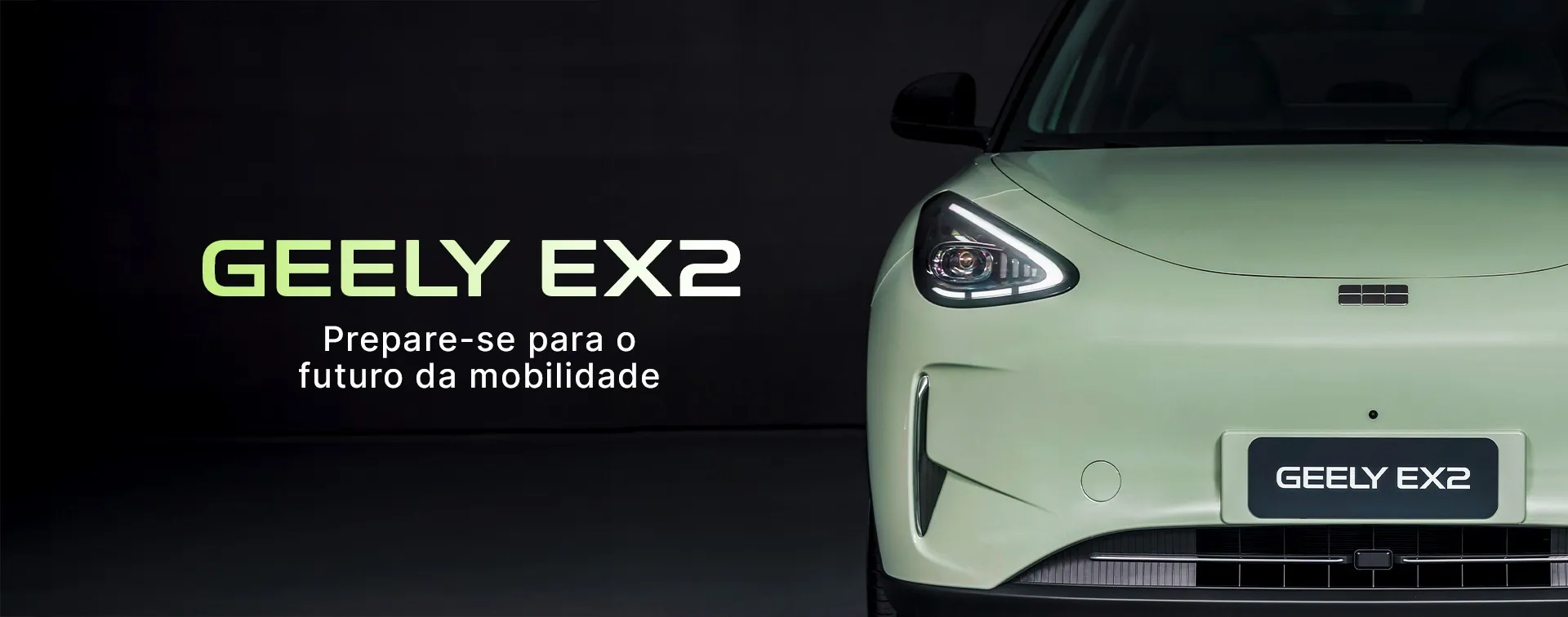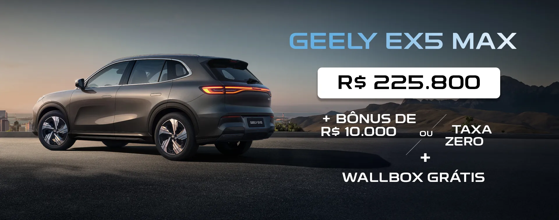 *Condição válida para pessoa física para aquisição perante a Rede de Concessionárias Geely para o veículo EX5 PRO, 0Km, ano/modelo 25/26, até 31/10/2025 ou enquanto durar o estoque. Preço à vista de R$ 195.800,00, já incluso R$ 10.000,00 de bônus. Adicionalmente, escolha entre um super bônus de R$ 15.000,00 ou taxa zero em 18 parcelas fixas, com 60% de entrada. Para mais informações consulte um concessionário Geely. Sujeito à disponibilidade de estoque. Imagens meramente ilustrativas. A aceitação do seminovo está sujeita à avaliação técnica da concessionária, que pode considerar fatores como quilometragem, estado do veículo, revisões em dia e aprovação em laudo de vistoria. Não serão aceitos veículos com uso comercial, blindados, movidos a diesel, modificados, com sinistros, débitos, gravames ou em nome de terceiros (exceto familiares diretos com comprovação). Todas as condições de elegibilidade podem sofrer alterações sem aviso prévio.. Especificações, preços e prazos de entrega podem sofrer alterações sem aviso prévio. Consulte a concessionária autorizada para mais informações.Valor em recarga de 1450 kWh equivalentes a aproximadamente 10.000 km será disponível exclusivamente pelo App Charge Pass da Mobilize e será creditado para utilização de até 1 ano, da data da emissão da nota fiscal.